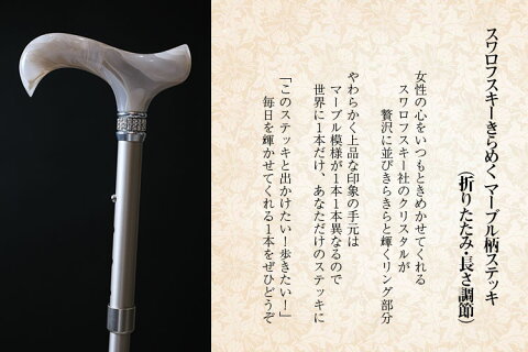ステッキのご案内 商品名 スワロフスキーきらめく マーブル柄ステッキ (長さ調節・折りたたみ) 特徴 ・女性の心をいつもときめかせてくれるスワロフスキー社のクリスタルが 贅沢に並びきらきらと輝くリング部分 ・やわらかく上品な印象の手元はマーブル模様が1本1本異なるので 世界に1本だけ、あなただけのステッキに ・「このステッキと出かけたい!歩きたい!」 毎日を輝かせてくれる1本をぜひどうぞ ステッキの種類 A:長さ調節のみ可能(折りたたみ不可) B:折りたたみ&長さ調節可能 グリップ(持ち手)の素材 シャフトの素材 アクリル製 アルミ製 グリップ・シャフト・杖先ゴムの色 黒/ワインレッド/青/緑/赤/パールホワイト ステッキの長さ 適応身長 重さ A:長さ調節のみ可能(折りたたみ不可) ステッキ:72〜94cm ご身長:約138〜183cm 重さ:約290g B:折りたたみ&長さ調節可能 ステッキ:80〜88cm ご身長:約154〜171cm 重さ:約350g 付属品 ・ステッキが初めての方にも分かりやすい取扱説明書同梱 ・折りたたみ時の収納に便利なホルダー付き ※レザー調ストラップをご希望の場合は、口コミご記入特典をお申し込み下さい お届け方法について A:長さ調節のみ可能(折りたたみ不可) ・通常時/ギフト包装ご購入時:白色化粧箱 B:折りたたみ&長さ調節可能 ・通常時:ヤマト宅急便コンパクト用茶色梱包箱 ・ギフト包装ご購入時:白色化粧箱 ※ギフト包装をご希望の場合は、ご注文手続き時「ラッピング・のし」項目にて「ギフト」をお申し込みください 有料ギフト包装の詳細はこちら 特記事項 万が一の際にも安心のPL保険加入済み(引受保険会社:あいおいニッセイ同和損害保険株式会社)