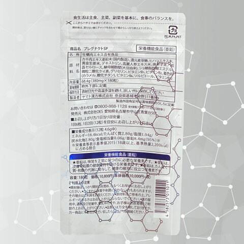 ■栄養成分表示(12粒 4,6g中) エネルギー18,4Kcal/タンパク質2,80g/脂質1,04g/炭水化物2,80g/食塩相当量0,06g/亜鉛8,4mg(95%) ※栄養素等表示基準値2015(18歳以上、基準熱量2,200Kcal)に占める割合 商品説明広告文責株式会社OES 052-736-2550 メーカー名、又は販売業者名株式会社OES〒463-0815愛知県名古屋市守山区青葉台507番地区分栄養機能食品(亜鉛) 製造国日本製名称 プレグナクトSP原材料名 牡蠣肉エキス亜鉛末、還元麦芽糖、ヒハツエキス末、黄金生姜末、デキストリン、高麗人参エキス末、唐辛子末/結晶セルロース、酵母細胞壁(大豆由来)、ショ糖脂肪酸エステル、微粒二酸化ケイ素、グリセリン、ビタミンB1、ビタミンB2、着色料(カラメル、酸化チタン)ビタミンB6、ソルビトール、ビタミンB12 内容量68.4g(380mg×180粒入り) 賞味期限商品に記載 保存方法 直射日光・高温多湿を避け、涼しい所に保存してください。