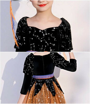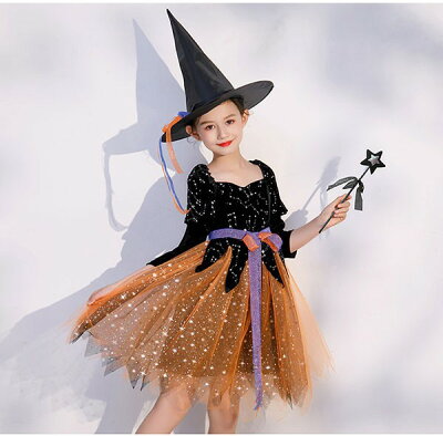 コスプレ 衣装 キッズ 子供服 ハロウィン 魔女 ウィッチ 女の子 ワンピース キラキラ 長袖 帽子 ステッキ コスプレ衣装 コスチューム プレゼント 可愛い パーティ イベント 変装 仮装 オレンジ ブラック パンプキン ジャックオーランタン 110 120 130 140 150 160
