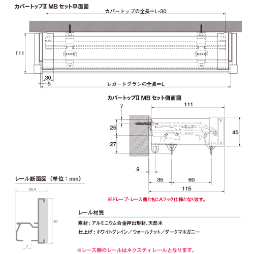 ・セット内容 レガートグランレール 2.03m 1本 レガートグランキャップMB(左・右)1組 ネクスティダブルブラケット3個 ネクスティランナー36個 ネクスティマグネットランナー2組ネクスティレール 2.00m 1本ネクスティキャップストップ2個キャップ一体型リターン金具N2個カバートップ2 2.01m×1枚カバートップキャップ2 1組固定クリップ2 3個取付ネジ ※MBキャップはステンシルバー色です。