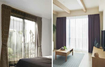 ミディアムグレイン[右]スタイリングコンセプト:レールは床と色を合わせることで空間になじませ、少し大人っぽいカラーのカーテンで全体を引き締めています。