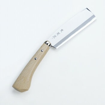 製品仕様 ■サイズ: 全長365mm 鞘入全長385mm 刃部 刃渡り180mm 刃幅53mm 刃厚6mm(最大) 柄部 長さ180mm 厚み24m 幅45mm(最大) 鞘 長さ265mm 幅72mm 厚み37mm ※ベルト通し含む ■重量:本体約510g 鞘含む約620g ■材質:青紙鋼+極軟鉄 ■刃形状:片刃 ■特徴 土佐屈指の鍛冶鉈による火造り鍛造品です 刃は青紙鋼と極軟鉄を鍛接しています 自由鍛造により鍛え上げられた強くかつ美しい刃です 職人が試行錯誤繰り返したどり着いた腰鉈として最適な刃付を施しています ■注意: 1丁づつ手造りの火造り鍛造品ですので製品によりサイズ等に個体差があります 錆止めとして刃物ニスを塗布しており、その分本来の切れ味よりは若干落ちます ニスを除去してご使用も出来ますが、非常に錆びやすくなりますのでご注意ください 鞘には飛出し防止のベルトが付いていますが、刃元が一部出る場合がありますのでご使用時はご注意ください 同シリーズのサイズ違いはコチラ 片刃(右) 120 150 165 180 195 210 240 300 両刃 120 150 165 180 195 210 240 300 片刃(左) 165 180 195 210 240 鉈 斧 鎌『極上』の切れ味と耐久性!”ほんまもん” の本職用腰鉈 高度な熟練の技が生み出した土佐鉈鍛冶の絶対の『自信作』 赤めた極軟鉄に青紙鋼をのせて鍛接します。